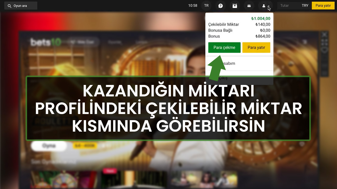 Peki kazandığında ne olur? Aşağıdaki görselde görebileceğin gibi profiline gidip kazandığın nakiti gönlünce kullanabilirsin. Çekebilir veya en güvenilir canlı casino sitesi Bets10'da diğer oyunlarda oynamak ve kazancını katlamak için kullanabilirsin.
